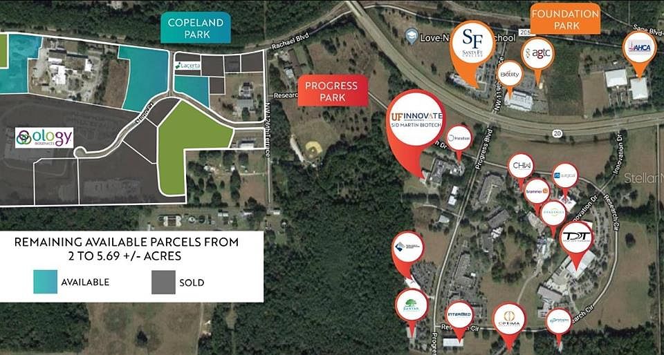 1.0 to 5.69 +/- acres. The land is divisible. Deed restricted industrial parcels in Copeland Industrial Park. There are several lot sizes and prices available. Build to suit and land lease may be available. Located within The Progress District, a well-established business districk in Alachua, Florida between Gainesville and Alachua. Copeland Paark has flexible zoning and accommodates a mixture of uses including office, warehouse, manufacturing, flex space as well as the needs of growing technology and biotechnology companies. Foundation and Progress Park neighbor Copeland Park with top research companies like Ascend, Evergen, UF Innovate, Intermed and many others. The location is just off of US 441 which has a daily traffic count over 18,000.