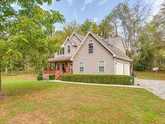 Stylish custom colonial on 1.5 acre lot. No HOA - bring the chickens and the RV! Property has been well maintained by the original owner. The partially wooded lot provides privacy for the wrap around front porch. The bright interior offers 9 foot ceilings on the main floor that also features 3 bow windows, a gas fireplace, decorative columns between the living and dining rooms , tray ceiling in dining room, plus a gas cooking stove in the kitchen! The primary bedroom has a vaulted ceiling with fan , walk in closet, and private bath with soaking tub. There are 2 additional bedrooms , a full bath, washer and dryer , plus a spacious bonus room with skylights over the garage that is currently being used as an office. The full basement with double walk out stairs is unfinished but awaits your personal touch. There is a rough in for a full bath, a water softener , passive radon system , and electrical wiring for a generator. The heat source is electric heat pump with propane back-up and central AC. Propane tank is owned . Community is located at the end of Mission Rd., but trash pick-up is curbside, and mail , UPS and Federal Express packages are delivered to the house. Don't miss this gem which offers custom quality, curb appeal, comfort, and privacy!