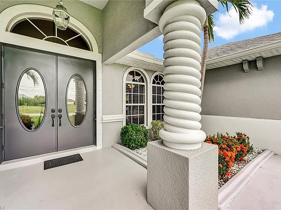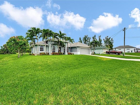 Welcome to this stunning 3-bedroom, plus den, custom-built home in Cape Coral's highly sought-after Burnt Store Road corridor, featuring 2,096 sqft of spacious living space. The owner's suite boasts luxurious features, including high cathedral ceilings, double walk-in closets, a relaxing soaker tub, a separate shower, and a stylish dual sink vanity. The impressive open-concept living space features a modern kitchen with breakfast bar seating and spotless Corian countertops, complemented by top-grade stainless steel appliances. The home also showcases wood flooring and tile throughout, ceiling fans for optimal airflow, a separate laundry room with ample cabinets, and an enclosed lanai for relaxation and enjoying the beautiful Florida sunshine. Situated on a spacious 0.23-acre lot with mature fruit trees, including bananas, mangos, and avocados, and extra room for a pool. Recent upgrades include a new roof (2019), A/C (2022), water heater (2022), exterior paint, irrigation system, and hurricane storm shutters. Notably, the city utilities water conversion has been completed. Located in an area with long-term demand and no HOA, this property benefits from exciting development prospects from the 7 Island project, nearby restaurants, shopping, walkable parks, boat ramps, excellent fishing spots, and access to open Gulf Coast waters. Enjoy easy access to neighboring cities like Punta Gorda and Matlacha, or take day trips to Sarasota, Tampa, and Orlando. With new infrastructure development underway and growing demand, this property presents a savvy investment opportunity for buyers looking to capitalize before prices rise. Plus, the home is available for purchase with negotiable furnishings or vacant, making it an attractive option for those seeking a seamless transition.