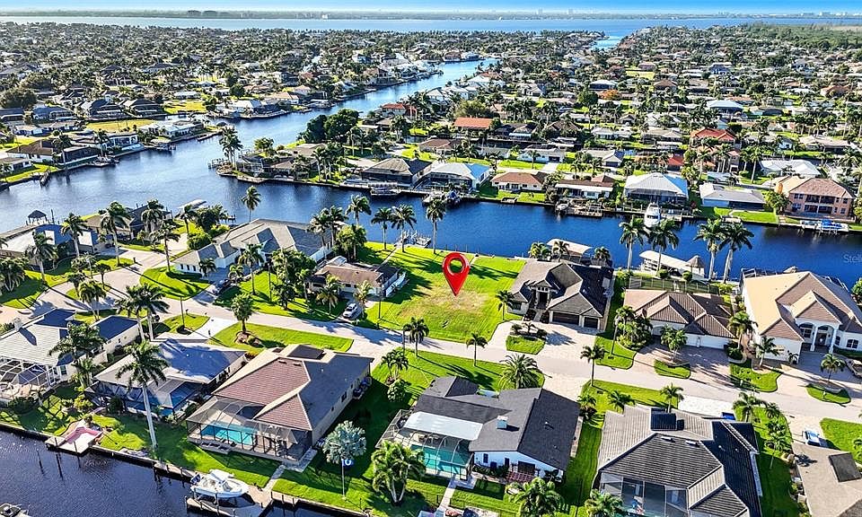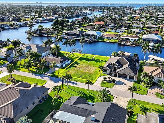 Unique opportunity to build your dream home on one of the few remaining true sailboat-access lots in Cape Coral’s coveted SW waterfront corridor. This oversized 13,000+ sq ft homesite offers an impressive 190-ft wide canal with a 14-ft deep water channel—just 15 minutes to the river with no bridges or locks to slow your route to open water. Nestled at the end of a quiet cul-de-sac of waterfront homes, this prime location offers both privacy and prestige. The southern rear exposure provides sun-filled days and stunning sunset reflections off the water—perfect for a future resort-style pool and outdoor living space. Enjoy the convenience of being centrally located between Cape Harbour and Tarpon Point Marina, where you’ll find waterfront dining, shopping, and boating amenities at your fingertips. With a seawall already in place, your build process is simplified and your vision can take shape immediately. Opportunities like this are rare—secure this exceptional property and design the luxury waterfront residence you’ve always imagined.