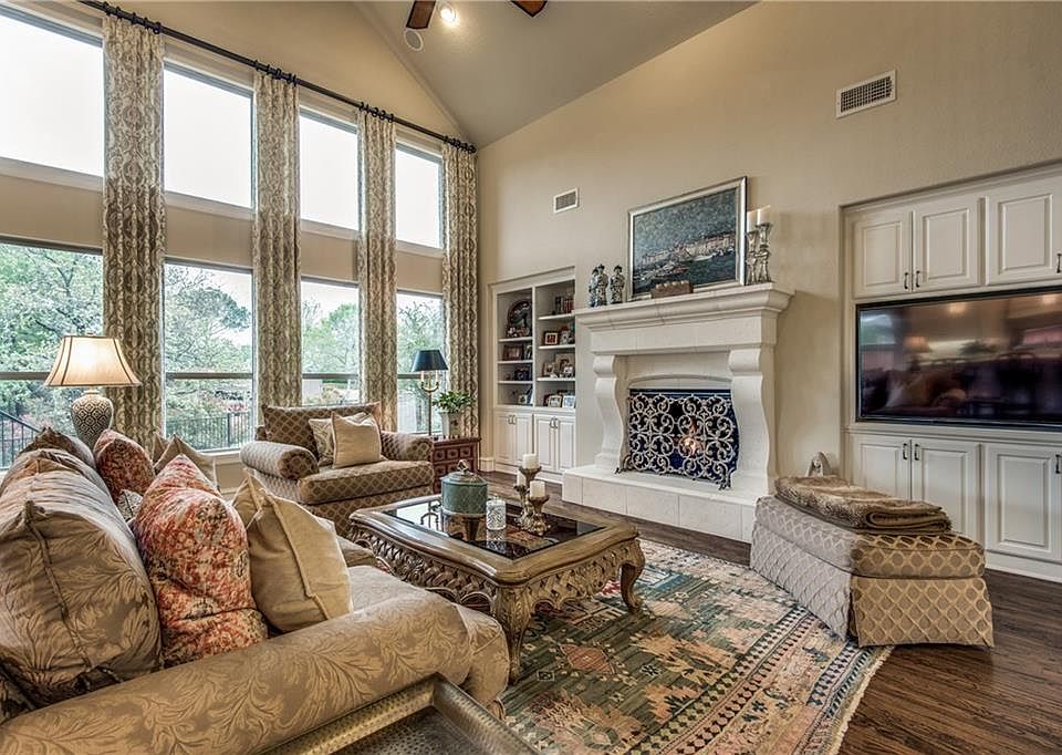 Over $100K in upgrades! Stunning inside & out with large open floor plan! 2-story entry with winding staircase opens to formal living & dining areas. Vaulted family room with wet bar, built-ins, stone fireplace, fabulous treetop view, open to white kitchen with granite counters, oversized center island, SS professional appliances & huge walk-in pantry. Master & quest bedroom down, 2 guest rooms, game room, workout area up. Enjoy Dallas skyline views from the covered deck. Hand-scraped hardwoods, marble master bath, master closet island & built-ins, plantation shutters & custom window treatments are just of few of designer touches throughout. Minutes to Las Colinas, Music Factory, DFW Airport, downtown Dallas.
