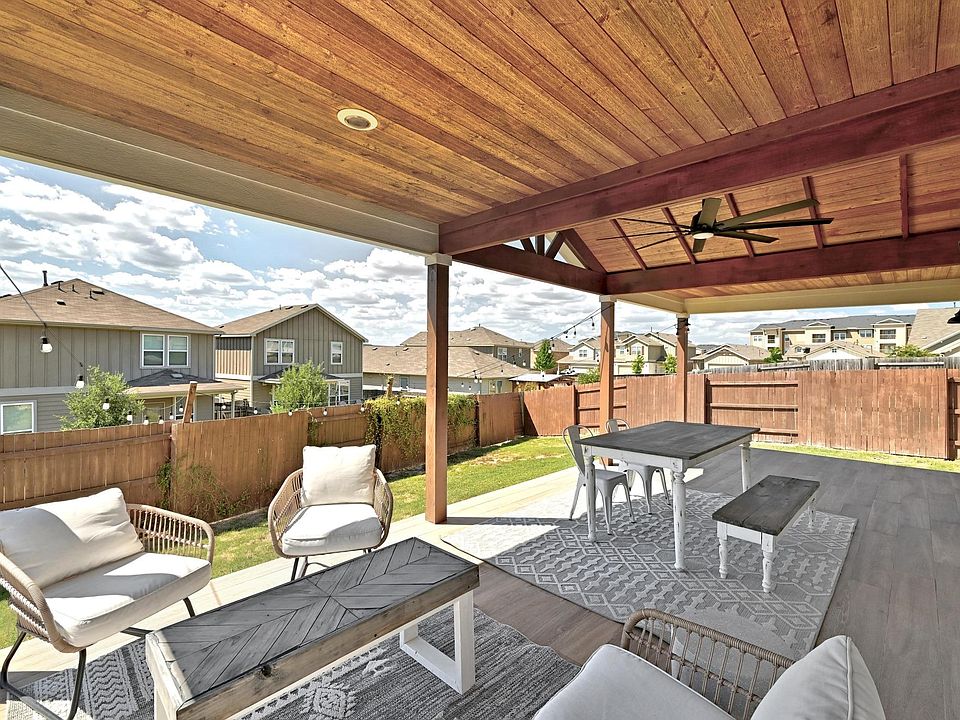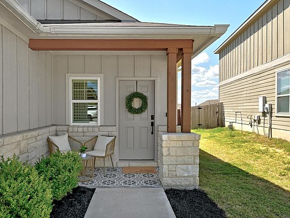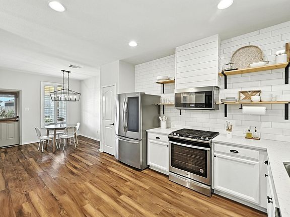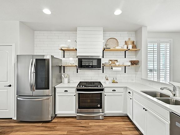 Don’t miss this gorgeous single-story home in the highly sought-after Sunfield community, filled with custom details and modern farmhouse charm you won’t find in most houses. The open floor plan showcases luxury vinyl plank flooring in soft neutral tones and is highlighted by designer touches like modern light fixtures, shutters, patterned tile, and striking accent walls that bring warmth and texture throughout. The chef’s kitchen features quartz countertops, stainless steel appliances, and a dramatic tile backsplash that extends all the way to the ceiling—adding an undeniably upscale feel. A breakfast bar flows into the family room, where a tray ceiling and cozy electric fireplace create a welcoming atmosphere. The private office is enhanced with stunning floor-to-ceiling wall paneling, blending style and function for the perfect work-from-home space. The secondary bath has been beautifully updated with an oversized walk-in shower finished in designer tile, delivering a spa-like touch to everyday living. An inset nook with a built-in bench, hooks, and shelving provides the perfect drop zone for backpacks, jackets, and shoes, while the laundry room offers additional storage with subway tile walls and floating wood shelves for a clean, modern aesthetic. Step outside to the stunning oversized patio, where a wood-paneled ceiling, ceiling fan, and tiled flooring create an inviting retreat. Whether hosting friends or enjoying quiet evenings under the glow of string lights, this space is ideal for both relaxation and entertaining. With a prime location across from a neighborhood park and access to Sunfield’s unmatched amenities—including pools, a lazy river, splash pad, dog park, fishing pond, trails, and more—this home truly has it all. Don’t let this one get away!