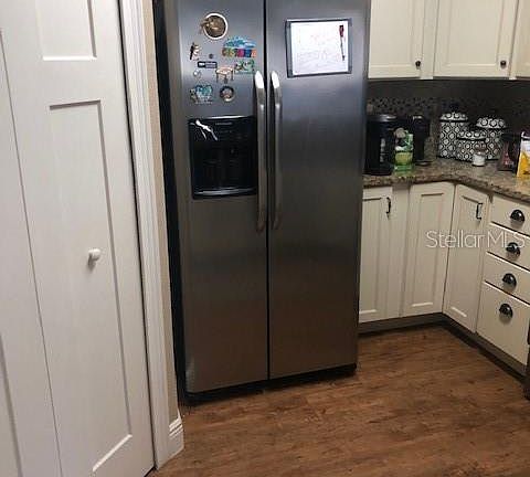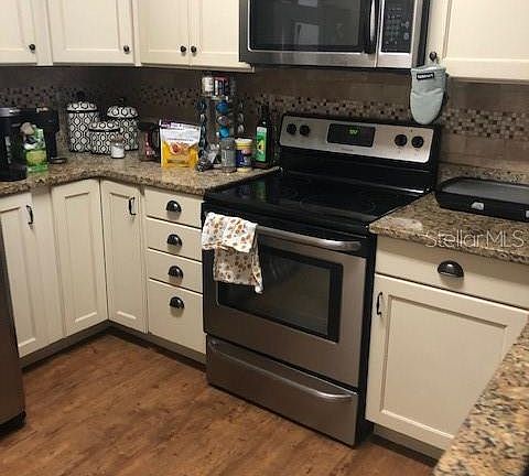 Granite counter topsGround floorWood cabinetsStainless steel appliances