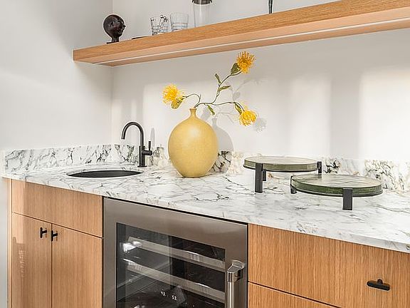 On the second floor is a guest suite and a formal living room. The living room is graced with a fully equipped wet bar and an attached terrace overlooking the backyard. The powder rooms on this level and the one below feature penny-round matte silver sage tiles and stylish Watermark faucets.