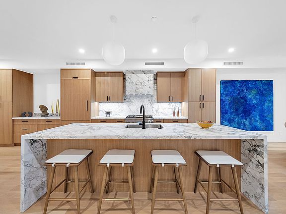 Enter into a welcoming sequence of spaces designed for gathering and everyday living. The generous chef's kitchen impresses with Calacatta stone surfaces, custom cabinetry, and a suite of integrated Thermador and Bertazzoni appliances. An inviting dining area transitions seamlessly to a serene backyard framed by lush planters, a patio for dining and entertaining, and a dedicated grilling station-an outdoor escape rare for this location.
