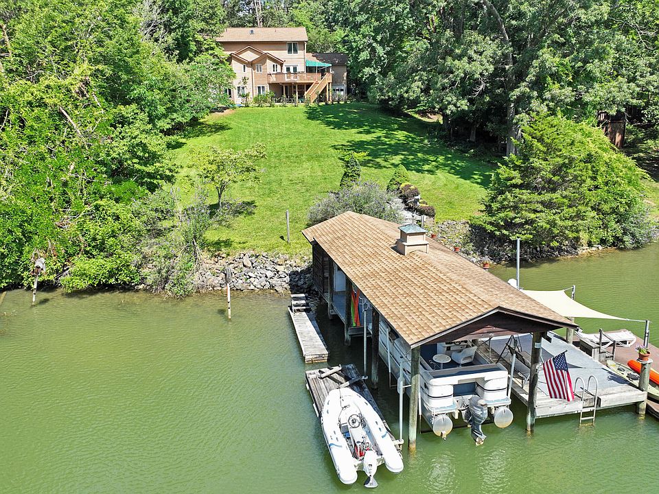 Custom-built 3,779 Sqft home wrapped in red cedar siding perfectly set on over one acresurrounded by Dogwood & Holly trees. Approx. 105' of waterfront! Lots of windows & Great Room w/cathedral ceiling, double-sided fireplace, tongue & groove ceiling, &hardwood floor. Den/Office w/built-in cherry wood cabinets and desk. The dining area& den access wrap around deck w/views of the lake, cove and dock. Master suite onmain level w/2 baths. Upper level has a Jack & Jill bedroom w/bath and skylight. Lower level is decorated as large bunk room for multiple sleeping areas, family & game room or In-laws suite. Laundry on main level & 2nd laundry room on lower level. 2 car garage on main level & lower-level garage. Covered boathouse w/cabana additional floating dock. House & dock sold as-is The opposite side of cove is not developed and adds to private wooded setting. House and dock sold As-Is.