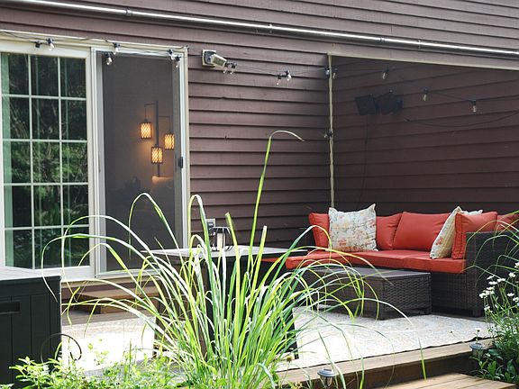 End unit, "One of the nicest at Woodbine" slate patio w/large yard.Refinished private deck,/direct access to walking/XC ski paths. 1-car garage with direct access to mudroom w/large closet with built-in shelving.Interior has been redone, New tile/vinyl plank flooring throughout; flat ceilings; freshly painted; updated electrical outlets; ceiling fans in bedroom & living room; updated light fixtures; new bedroom doors; new ‘top down’blinds throughout. Renovated kitchen has granite countertops, newer dishwasher & stove; cabinetry has recessed lighting, pantry storage; soft close doors/drawers; butcher block countertop; oversized stainless steel sink 1/2 bath has new sink w/granite counters,floating cupboard, new toilet, light fixture. Updated full bath w/new toilet, shelving unit & tub fixtures. Both bedrooms are on the 2nd floor, large closets; TV w/mount inthe primary bedroom included. HOA recently replaced windows, roof Near Bike and walking paths and public recreation.