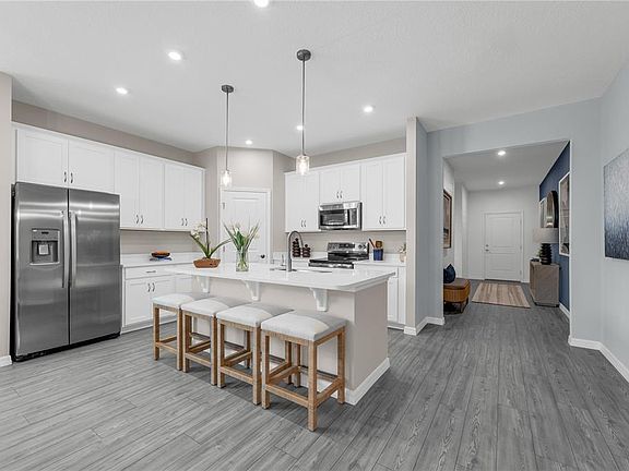 One or more photo(s) has been virtually staged. Under Construction. Located in the heart of Eustis and a short drive from downtown Mount Dora, Hidden Cove offers easy access to a variety of shopping, dining, and entertainment options. This peaceful, secluded neighborhood is surrounded by the stunning beauty of multiple lakes, including Lake Eustis, the focal point of the Harris Chain of Lakes, and West Crooked Lake, right next door. With numerous parks and golf courses nearby, you'll never run out of outdoor recreational opportunities. At Hidden Cove, enjoy the perfect balance of living in a private neighborhood near tranquil lakes, quaint downtown areas, and many local attractions. The Portland is the perfect floorplan to take advantage of the Florida lifestyle. In this home, guests are greeted by a covered entryway that leads to a spacious living room on the main level. No matter where you are in this space, the open floor plan is a great place to entertain family and friends. The kitchen island allows for natural movement through the main level, keeping the kitchen as the focal point of the home. Two spacious bedrooms share a bathroom on the main level, and the true showcase of this home is the primary suite, which offers utmost luxury and privacy. It has everything you need with dual vanities, a large walk-in closet, and a walk-in shower. This home is an oasis for those looking for a new construction home, built for the way you live!