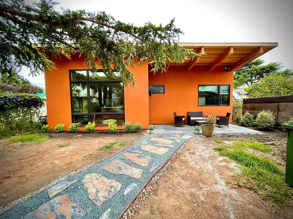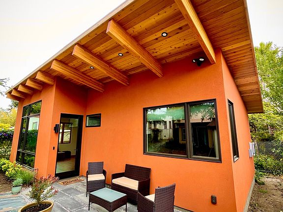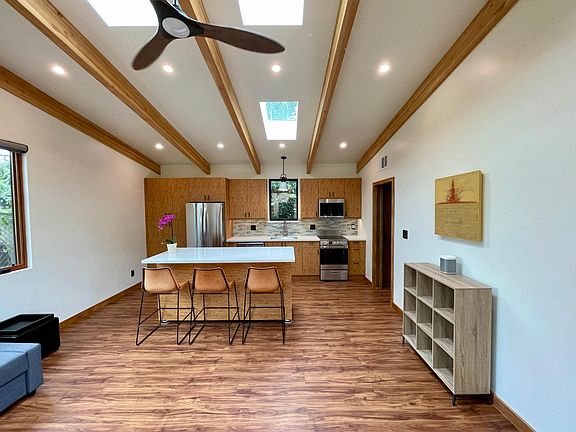 Beautiful new ADU! All new construction, finished July 2022. All-electric appliances, heat pump HVAC and water heater. Waterproof engineered wood flooring throughout. Radiant heat in bathroom floor, wall-mounted dual-flush toilet and vanity. In-unit washer/dryer with storage closet. Huge closet in bedroom. Floating island and ample cabinetry in kitchen area. Skylights in main room and bathroom, circulation fan in main space. Vaulted ceiling in living area and bathroom creates a roomy feel throughout. Utilities included, with the exception of internet provider. Street parking, security gate and separate entrance. Shared storage and yard. Lovely patio under eaves. Ring security doorbell and motion-activated lights and security camera from roof corner. Attentive and friendly landlord and landscape maintenance.