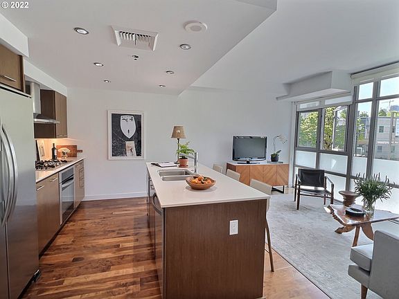 Great value on this light and bright true 1 bedroom unit, conveniently located on the second floor, featuring an efficient layout, views of the west skyline, Electrolux kitchen appliances, hardwoods, quartz counters, full size washer/dryer, walk-in closet, and oversize tub. Waterfront Pearl living includes: secure access, concierge, exercise room, shared patio/bbq, just steps away from the Willamette river and stunning water views. Enjoy proximity to eats, treats and boutiques of the trendy Pearl. Don't miss out!