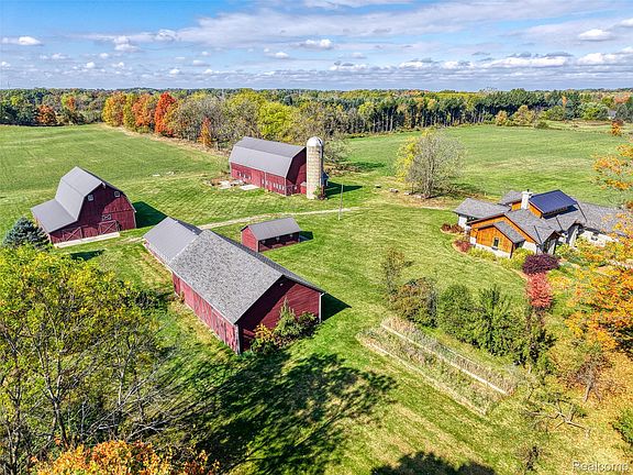 Unique stone fireplaceFinished basementSurrounded by open acreageMature treesImpressive great roomSoaring ceilingsFive well-maintained barns