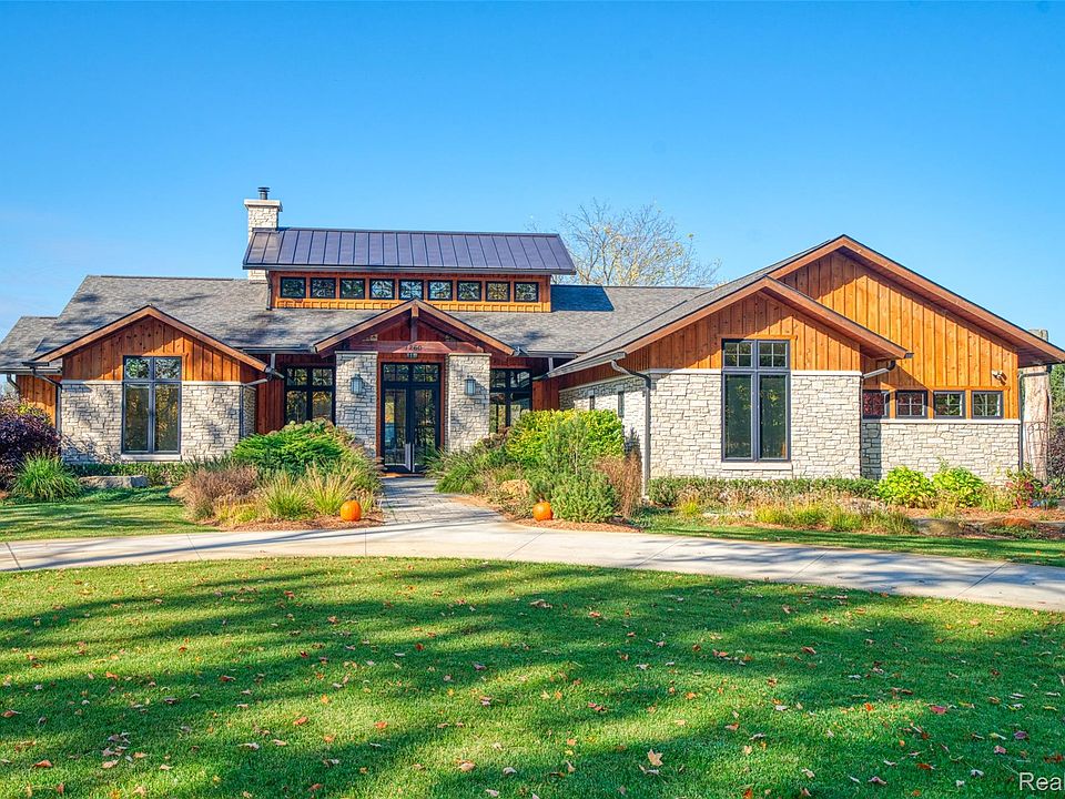UNIQUE CUSTOM BUILT, ARCHITECTURALLY DESIGNED RANCH HOME SET ON 27.5 ACRES-OFFERS PRIVACY, remaining just minutes from town and freeway access-ideal for relaxation and convenience. Thoughtfully crafted with quality and comfort in mind, this property offers a rare combination of elegance, functionality, and space. The home features an IMPRESSIVE Great Room with soaring ceilings, a conversation area in front of the unique stone fireplace, and a wet bar perfect for entertaining. Solid walnut wood flooring enhances the warmth of the home, and the large dining area flows seamlessly into the open kitchen, creating a warm and inviting space for both large and intimate gatherings. The finished basement offers an ample space for gaming, another wet bar, a full bath, and an area for your workouts or yoga sessions. As a bonus, there is an ELEVATOR to utilize if needed, between floors, and it is right off the kitchen. Outdoors, you'll find five well-maintained barns totaling over 8,000 square feet, each with lighting and water access. The 41'x60' horse barn includes four stalls, a tack and equipment area, and upper-level hay storage, all in excellent condition that any horse enthusiast will appreciate. Surrounded by open acreage, mature trees, and peaceful views, this property offers a unique opportunity to own a one-of-a-kind ranch estate, thoughtfully crafted with versatility in mind and with room to breathe, work, and play.