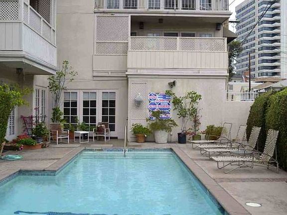 Spacious and quiet rear facing 2Bd/2B ground floor 1 block south of Wilshire condo,excellent location walking distance to Century City, and one mile to UCLA. Extra large and spacious unit features marble flooring throughout ,bright cozy kitchen,wet bar,large dinning area and a grand living room with french doors leading to small private garden patio. Master en suite with THREE walk in closets,dual vanities,full showers and spa tub.Two car indoor parking with additional storage bin. Side by side washer and dryer ,other amenities include swimming pool,poolside showers,a kitchenette,sauna and cardio room.Lives like a home with all the conveniences of a condo . Truly a must see. Available now .