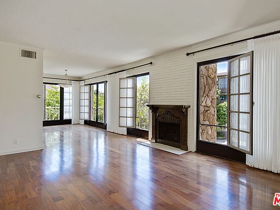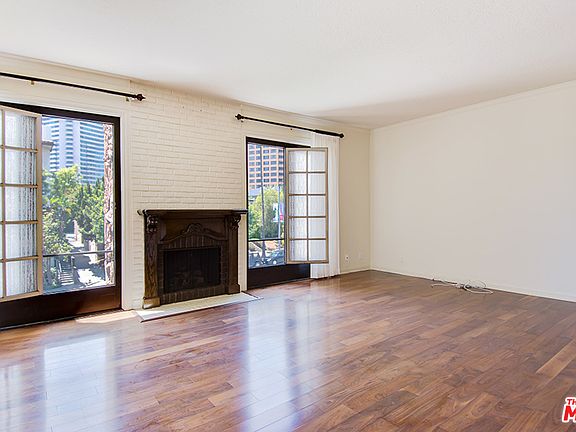 This large 2 bedroom + 2 bathroom corner unit has a great floor plan and is very homey. Windows and French doors span the length of the living and dining rooms, and wood floors and a fireplace exude warmth and charm. The master bedroom and bathroom are en-suite, and the bathroom has dual sinks, a claw-foot tub, and separate shower. A 3/4 bathroom and laundry area for a side-by-side washer and dryer is located outside the second bedroom. There is a balcony with views of tree tops and the city lights of the Wilshire Corridor. Centrally located close to UCLA, Beverly Hills, Century City, and the renovated Century City Mall.