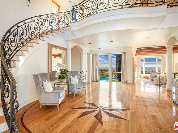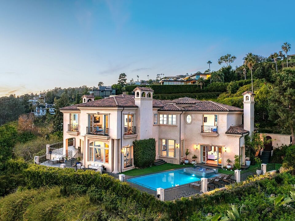 Perched atop a private cul-de-sac promontory above the Sunset Strip, this majestic estate offers castle-like grandeur, exceptional privacy, and panoramic city-to-ocean views.A dramatic flagstone motor court leads to a stately courtyard and 9,400 square feet of timeless Mediterranean design blended with modern sophistication. From the grand foyer featuring 30-foot vaulted ceilings and a sweeping staircase to the spacious living, dining, and family rooms, each space is designed to showcase breathtaking views from Downtown LA to Catalina Island. The gourmet kitchen is a chef's dream, outfitted with granite countertops, Viking appliances, Sub-Zero refrigeration, dual dishwashers, and a walk-in pantry. French doors open to a patio and BBQ area ideal for al fresco dining against the backdrop of Pacific sunsets. Upstairs, the primary suite is a private sanctuary with a sitting room, fireplace, wet bar, three Juliette balconies, and a sprawling terrace with commanding views. Dual spa-style bathrooms feature soaking tubs, steam showers, and custom walk-in closets. Four additional en-suite bedrooms offer luxury accommodations for family and guests. The lower level boasts a media room, custom wine cellar, yoga/dance studio, and a private guest suite with separate entrance. A private elevator connects all levels, and amenities include a three-car garage, ample guest parking, dual laundry rooms, and full smart home integration for effortless living. This is more than a home it's a private retreat designed for grand entertaining and serene living in one of LA's most coveted locations.