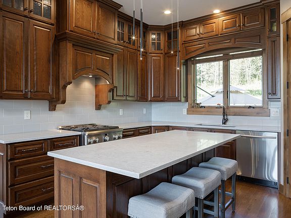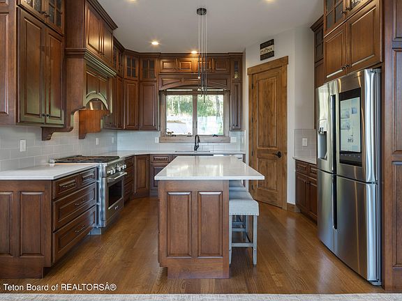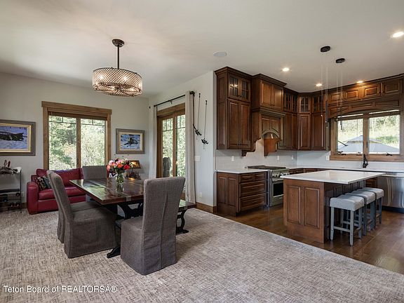 A 40 min drive to Jackson, is this private 2.15 acre estate, bordering 3,000 acres of Greys River Wildlife Habitat and the National Forest. Built in 2017, this luxury retreat was designed and built with fit and finish. 2 master suites, 2 ensuite bedrooms, 2 powder rooms, living room, dining, family/theater room, loft/office space, 2 car garage, and a finished detached garage/shop.The main living level is complete with a formal living room, timber beam archways, white oak hardwood floors, rock propane fireplace, and outstanding views to the valley. The spacious dining room with its' own fireplace has access to an elevated deck and a new 575+ sq. ft. composite deck. With the open kitchen, custom cherry cabinetry, quartz countertops, and pantry is a must for... 2023-11-10