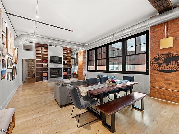 Tastefully designed, two-bedroom, two-bath condominium located in the historic Warehouse District in downtown Cleveland. This light-filled home offers natural oak wood floors, tall ceilings, a wall of windows, in-suite washer & dryer, and floor-to-ceiling custom bookcases. The beautiful primary suite features a wall of exposed brick, 2-way fireplace, and custom closets. The fully tiled master bath boasts a colossal shower, double sinks, and extra closet space. Fall in love with the ultimate cook's kitchen which presents gorgeous granite countertops, top-of-the-line GE profile appliances, stainless steel hood over the stove, subway tile backsplash, and tall maple cabinets with pull-out drawers. Walkable, accessible and convenient, this condo is situated next to restaurants, nightlife, sporting venues, office buildings, transportation, and brand new Sherwin Williams Headquarters.