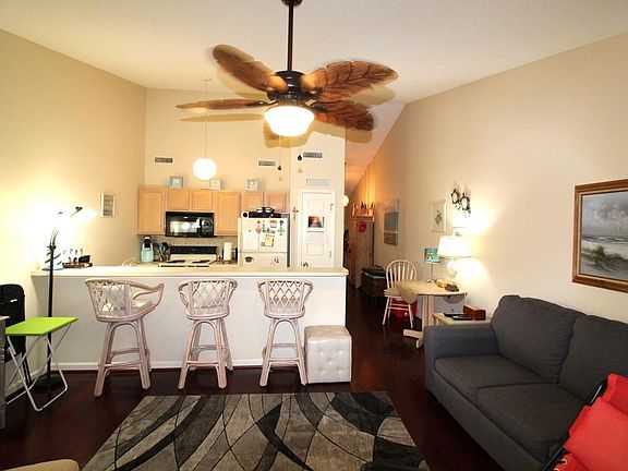 This 1BR/1BA condominium at Island Green South is a top floor unit in a 2-story building, high ceilings and no upstairs neighbors. Sold furnished with wood floors throughout the living areas. There is a screened-in back porch. Community pool & mailboxes are just across the parking lot from this unit. HOA dues provide for basic cable and internet access through Spectrum. Ideal for a vacation retreat, second home or to generate rental income. The unit can be rented to vacation renters and annual tenants. Convenient South Strand Location close to all the attractions the Coastal Carolinas have to offer.
