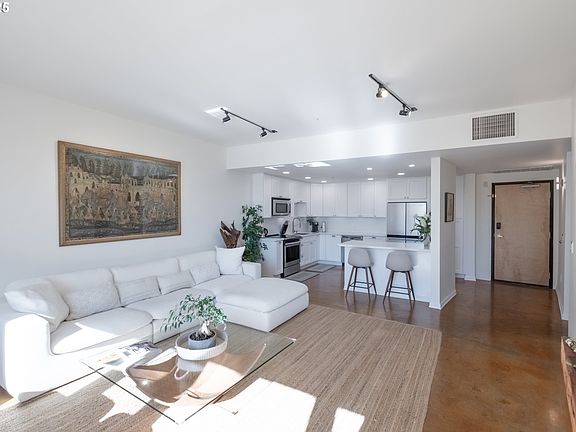 Step into modern condo living at The Round— This beautifully remodeled home features open-concept living, expansive windows, high ceilings, and serene territorial views. The kitchen shines with sleek quartz countertops, stainless-steel appliances, and a modern aesthetic perfect for entertaining. The bathroom offers dual sinks, tile flooring, and a large glass-enclosed shower with modern tile enclosure.The primary bedroom showcases floor-to-ceiling windows and a spacious walk-in closet, while the second bedroom opens to a private deck. Enjoy the perks of a secured building with elevators, garage parking with EV-charging capability. Just steps from the MAX Light Rail, this prime location connects you effortlessly to Portland and beyond. Surrounded by Beaverton’s best dining, coffee, and nightlife—including food carts, pubs, and The Reser Center for the Arts—plus restaurants. Walk Score 97 / Bike Score 84 – premier urban living in a secure, modern building at the center of Beaverton’s vibrant expansion.