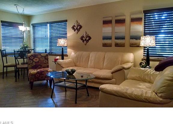 You MUST SEE this beautifully remodeled 2 bedroom, 2 bath, ground floor condo being offered turnkey/furnished! Located in one of the most convenient locations in South Fort Myers, walking distance to Ada's market and close to everything ! The tastefully remodeled kitchen includes granite counters, dark wood cabinets, stainless appliances, tiled backsplash and wall. Tile floors throughout that look like wood flooring for easy maintenance. Some features of this condo, insta-hot water heater, stacked washer and dryer, new cabinets and granite counters in bathrooms, upgraded lighting fixtures, walk in closets in bedrooms, office/desk area near screened lanai entry. Perfect for a seasonal home or a vacation rental. Call today to see this gem!