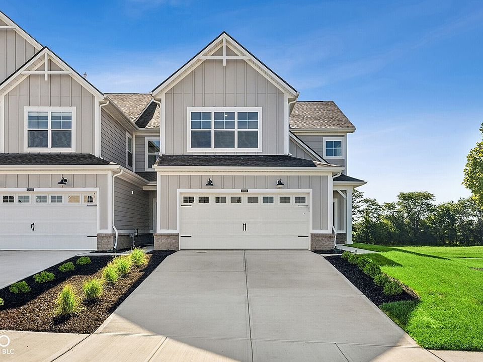 Located in Noblesville, this stunning new construction townhome offers a stylish two-story design with 3 bedrooms, 2.5 bathrooms, and a 2-car garage. Thoughtfully planned with open living areas and private retreats, this home is both functional and inviting! The main level boasts a spacious gathering room with an electric fireplace, a dining nook, and an open kitchen with a large island and walk-in pantry-perfect for entertaining and everyday living. A guest entry, powder room, and convenient owner's entry add extra functionality, while the rear patio extends your living space outdoors. Upstairs, the expansive owner's suite features a spacious layout with a tray ceiling, a generous walk-in closet, and a private bath with dual sinks, soaking tub, and walk-in shower. Two additional bedrooms-each with their own walk-in closets-share a full bathroom. A centrally located laundry room completes the second floor for added convenience. This townhome combines modern design, ample storage, and comfortable living spaces, making it an excellent choice for homeowners looking for low-maintenance living in Noblesville!