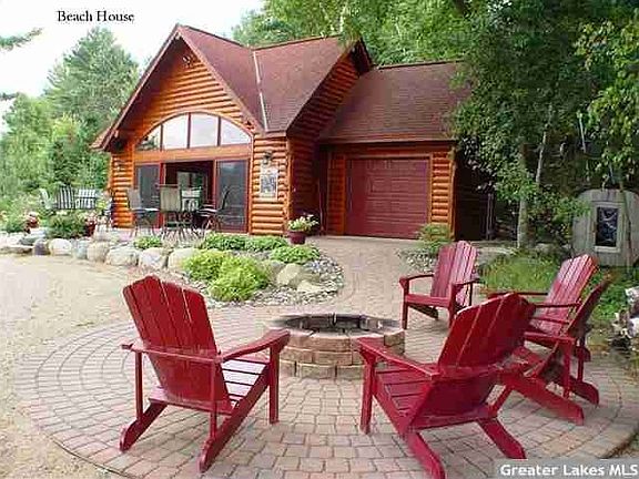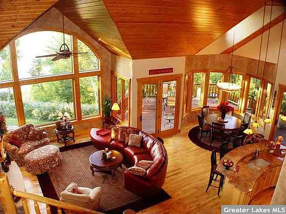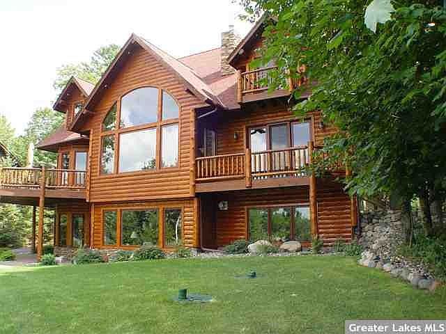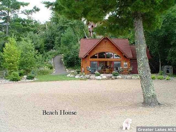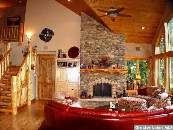 Amazing views of Lower WF/Island Lake w/perfect sand beach and beach house. Home has log siding and extensive log accents. Vaulted pine ceilings, Maple hardwood floors, gourmet kitchen, 20' fireplace, large master suite w/private balcony. Agent/Owner