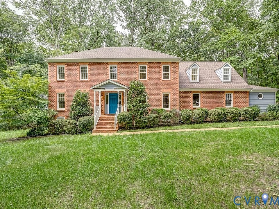 Stately brick Colonial in highly sought-after Roxshire, perfectly situated on a private 1+ acre cul-de-sac lot within the coveted James River High School district. Offering 3,354 square feet of living space, this meticulously maintained 5 bedroom, 2.5 bath home features a desirable floor plan with dual staircases, elegant formal rooms with crown molding, and beautiful hardwood floors. The interiors have been freshly painted and the exterior has been power washed, giving the home a crisp, move-in-ready appeal. The updated gourmet kitchen boasts granite countertops, stainless steel appliances, gas cooking, dual pantries, and abundant cabinet space, flowing into a vaulted morning room filled with natural light and skylights—ideal for casual dining or relaxing with a view of the backyard. The inviting family room showcases exposed wood beams, a brick fireplace, and direct access to the morning room and deck. Upstairs, the spacious primary suite offers vaulted ceilings, skylights, a spa-like bath with tile floors, jetted tub, separate walk-in shower, dual vanities, and newer fixtures. All bedrooms are generously sized, including a large 5th bedroom/flex space perfect for a playroom, media room, or home office. Outdoor living shines with a multi-tiered deck overlooking mature landscaping and a private, tree-lined yard—perfect for entertaining or quiet evenings. Additional highlights include a large walk-up attic, walk-in crawl space, oversized driveway, and a creek in the backyard. Conveniently located near shopping, dining, and recreational amenities, with easy access to top Chesterfield schools and major roadways. A rare combination of space, updates, and location—don’t miss it!