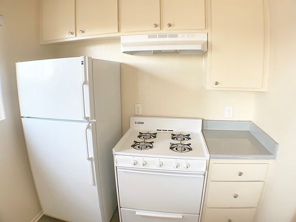 Features include new range hood, stove with two new racks, new fridge, reglazed kitchen bar top, reglazed tub and tub walls, new bathroom mirror, A/C, and walk-in closet. Shared laundry facility on-site. Small pets (under 25 lbs) allowed with a $25 monthly pet fee per pet. 24/7 surveillance in garage and lobby areas.
