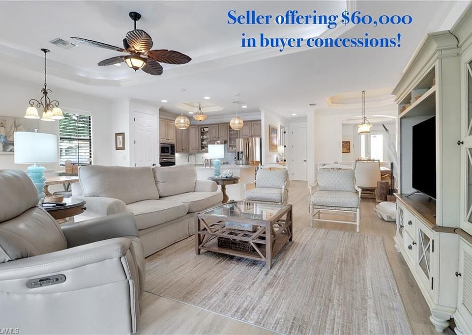 Seller is offering a concession of $60,000 with a signed Contract. Golf available at 12605 Fenhurst Way! This stunning home features 3 spacious bedrooms, a versatile den, and 2 luxurious bathrooms, all thoughtfully designed to cater to your lifestyle needs. Step inside and be greeted by the refined ambiance of crown molding throughout, accentuating the home's sophisticated charm. The gourmet kitchen is a chef's delight, boasting beautiful two toned glazed cabinets paired with matching quartz countertops, complemented by stainless steel appliances and a large island, dining room and eat-in kitchen. The open layout seamlessly connects to the living areas making this home perfect for entertaining. Your master suite is a serene retreat, offering tranquility and comfort, while the additional bedrooms provide ample space for family or guests. Impact windows and doors, along with hurricane shutters, ensure peace of mind and safety. Outside, indulge in the ultimate Florida lifestyle with your private saltwater pool, complete with solar panels and a panoramic screen. The outdoor patio, features an outdoor kitchen with a sink and a cozy extended sitting area, offering breathtaking lake views, perfect for unwinding after a day on the golf course. Additional features include a 500-gallon in-ground whole house generator and a comprehensive water treatment system. Twin Eagles is one of the finest communities in Southwest Florida, offering 1,115 acres of natural tranquility and two Championship Golf Courses—the Talon course designed by the Nicklaus Group and The Eagle Course designed by Steve Smyers. Enjoy the newly renovated state-of-the-art Clubhouse, bocce courts, Himalayan putting green, fitness center, tennis, pickleball, resort pool, and tiki bar.