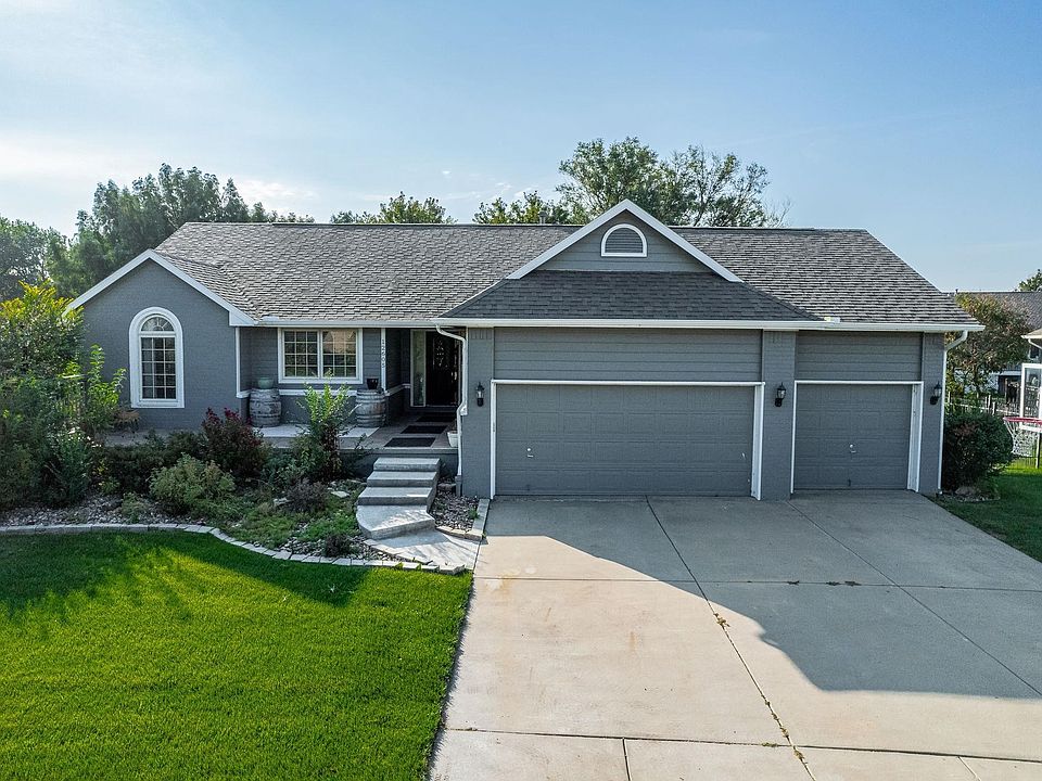 Welcome to your dream home in the heart of the sought- after Goddard school district! This immaculate 4 BR, 3bth home is move in ready with the following items updated within the last year: paint, carpet, ceiling fans, light fixtures, toilets, and faux cordless blinds. As you step inside, the open floor plan and vaulted ceilings create an inviting atmosphere. The wood flooring adds a touch of elegance that compliments the granite counters and the open kitchen, perfect for entertaining. Two cozy gas fireplaces grace this home, offering warmth and charm. Enjoy your morning coffee on the covered back deck overlooking the large wrought ironed fenced yard with sprinkler system and well, or greet guests on the large custom stamped concrete front porch. The main floor laundry will make daily chores a breeze, and the view out basement features a wet bar, bonus room, and plenty of room for the family and friends to enjoy. Situated on a cul-de-sac, with a 3 car garage, this home offers both privacy and community. Don't miss your chance to call this exceptional property your own. Schedule your showing today and start living your dream!