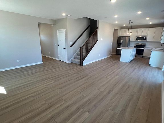 Large center islandOpen floor planSpacious gathering roomThree bedroomsLaundry upstairsPreserves trails ponds