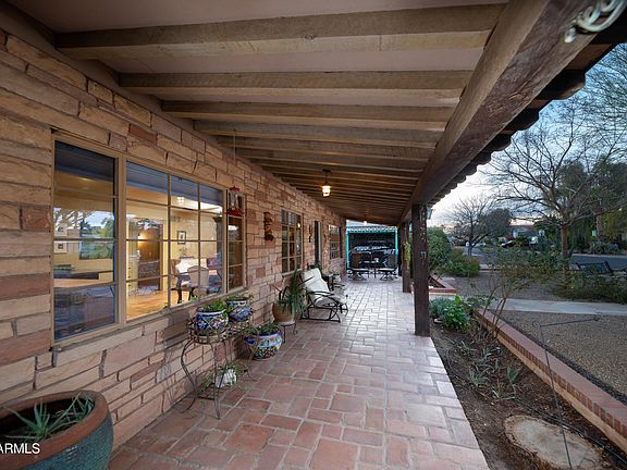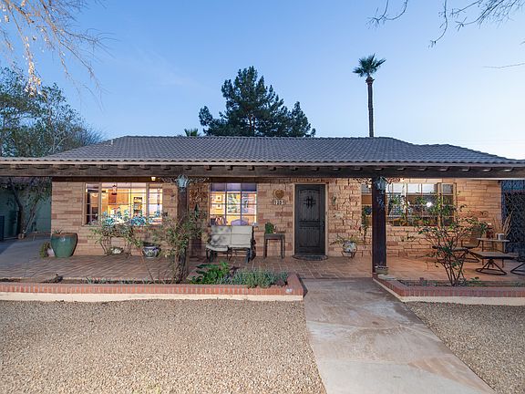 Check out this stone front stunning ranch dream home inside of the Country Club Manor quadrant of Coronado Historic District, one of the most coveted micro locations within the neighborhood known for its larger maturely landscaped lots, spacious 1950s ranch layouts, and meandering blocks that are highly walkable, with friendly neighbors, porch concerts, bike paths, nearby eateries, and coffee shops. The front porch alone will knock your socks off, spanning the entire length of the house, with rough hewn beams that match the warm, earthy southwestern style of the home inside and out. Notable features include an open concept floorplan with updated lighting and ceiling fans t/o, vintage guest bath with rare original tile surround, tons of linen and closet storage t/o, light-filled bedrooms with rear yard views, separate soaking depth tub and upgraded tile shower in the master bath, upgraded Berber carpet in the bedrooms, upgraded solid wood kitchen cabinetry, eat-in kitchen with breakfast bar, granite countertops, kitchen island (conveys), upgraded farm sink, and additional dining area, walk-in laundry room with utility sink, pantry, and milk door (in working order!), washer and gas dryer (both convey), original detached brick built garage with matching stone facade, upgraded electrical, newer garage door, and concrete slab foundation, and a grassy, shaded, backyard oasis including a serene and functional fountain, southern shade giving Pine trees, regularly trimmed and fed by a professional arborist, an Orchid tree, a Tipuana tree, a raised fire pit area, large stone patio, and an oversized two car carport with RV gate that doubles as a ramada for entertaining when not in use. Additional updates and upgrades include a newer HVAC (2023), newer tile roof (2018), upgraded Jenn Air stainless steel gas range, newer dishwasher (2024), upgraded kitchen plumbing, newer gas water heater, newer front desert landscaping, and a recently added cozy "catio" off the master bedroom. To live in this subsection of Coronado is to live in one of the most special, walkable and friendly blocks of any neighborhood in town! This home reflects the warmth, stability, and unique homey comfort only found in really special properties and will go fast. Don't miss it!