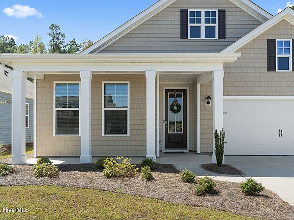 Discover this beautifully maintained single-level home in the highly desirable community of the Grove section of The Farm. The Grove at The Farm offers an incredible amenity package that includes a clubhouse with an outdoor pool, fitness room, yard maintenance w/ irrigation & internet all for just $210 a month! This home features a bright, open-concept layout, combined modern living and elegant design. With three spacious bedrooms plus a versatile flex room perfect for an office, this home is designed for both comfort and functionality. The well-appointed kitchen boasts stunning white cabinets, a generous island ideal for meal prep and casual dining, and a large pantry for added convenience. The primary bedroom offers a luxurious retreat with a walk-in shower, dual vanities, and a sizable walk-in closet. Enjoy outdoor living with a charming front porch and a relaxing screened-in back porch. An additional patio outside the screened area provides extra space for outdoor entertaining, all set against a tranquil backdrop of trees. The location in Carolina Shores ensures a short drive to beautiful beaches and coastal amenities.