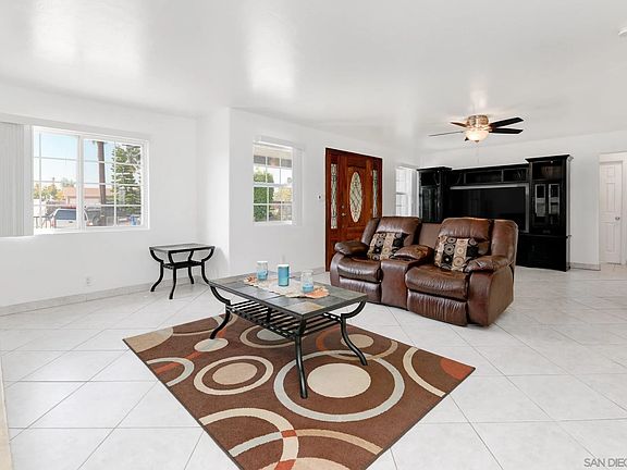 ENTERTAINERS DELIGHT!! Single-story 1,710 sq ft home on a quiet cul-de-sac tip, set back from the main road. 1261 Helix is planted on a flat street, but the rear property line sits above a bluff with 180° unobstructed views—city lights at night, neighborhood below, and wide-open sky by day. The back yard is huge and tailor made for a good kickback, a birthday or a Superbowl party. Inside: dual-pane vinyl windows and sliding doors throughout. Tile floors in kitchen, living, and traffic areas; carpet in bedrooms. Every room has a new ceiling fan with remote. Large living room with oversized fireplace. Open kitchen features granite counters, stainless steel appliances, and direct sightlines to living and dining spaces—ideal for hosting. Dedicated laundry room. Full interior and exterior repaint completed. Outside: fully gated with rolling front gate. Wide main driveway plus separate RV driveway runs full length of the house to rear patio. Back patio is poured concrete with pergola cover. Entire front and back yards upgraded with pet-grade artificial turf—dense, durable, and low-maintenance, stays bright year-round. 6-ft wood privacy fencing encloses the full perimeter. Leased solar panels cover 100% of the current owners’ annual electric bill. Location balances seclusion with access: minutes to I-805, shopping, and daily needs in Chula Vista, yet traffic noise is minimal. Practical, updated, and positioned for views, parking, and privacy. VA approved all day. The perfect mid sized Single Family Home at a great price.