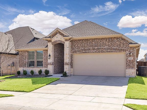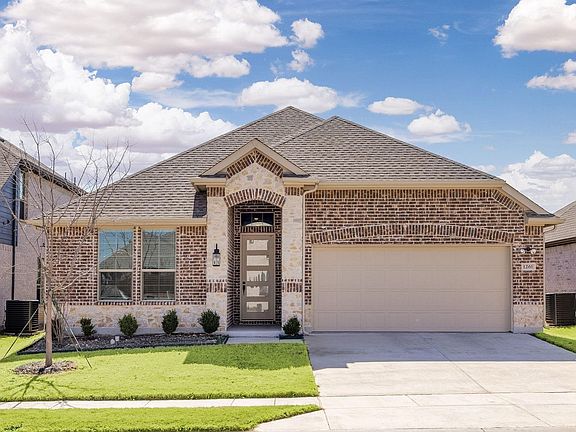 Stunning Modern One-Story K. Hovnanian Home in Justin, TX! This energy-efficient home is designed with an advanced fresh air ventilation system to ensure clean, filtered air for a healthy and comfortable living environment. The open-concept living area exudes warmth and elegance, centered around a striking stone fireplace that adds a cozy ambiance. Expansive windows flood the space with natural light, highlighting the rich textures of the furnishings. The seamless layout integrates the living, dining, and kitchen areas, promoting relaxation and perfect for entertaining.