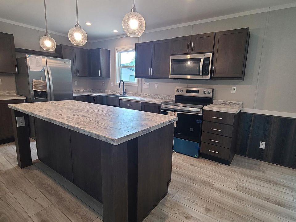Price improvement! Stunning 4 bedroom, 2 bath home sitting on a 1-acre lot without any restrictions. County-feeling neighborhood, yet close to city amenities. Great open floor plan with primary bedroom separated from the other bedrooms and separate family room located near the secondary bedrooms. Living room has plank looking Linoleum floors. Kitchen finished with dark cabinets, huge modern island in the middle, back splash and stainless-steel appliances with refrigerator and SS farmhouse sink and a huge walk in pantry. Primary bedroom has plank looking Linoleum floors with a walk-in closet. Large primary bathroom with separate shower and garden tub. Secondary bedrooms are well sized and plank looking Linoleum floors throughout. A metal roof comes with this newly built. A new septic permit has been approved and issued, waiting for the installation to be done.