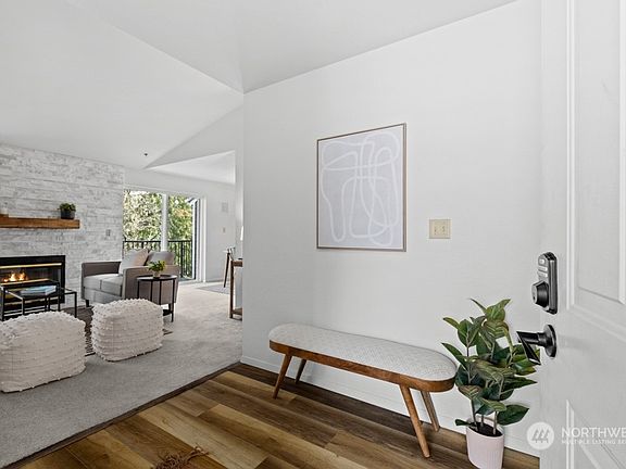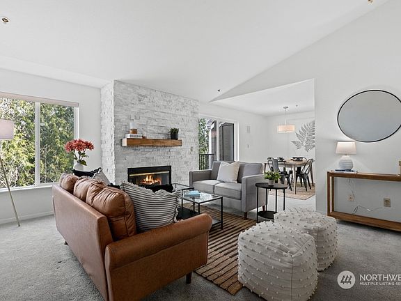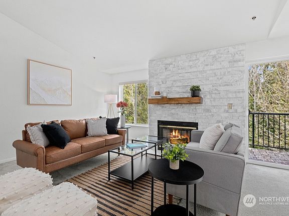 Impeccable design, stellar location! Rare top floor end unit enjoys greenbelt views, individual garage plus reserved prkg. Big windows, classy frplc, sophisticated finishes, smart thermostats are found throughout the light-filled spaces. Up-tempo kitchen features SS applcs, polished countertops, pantry. Nice-sized bdrms, two stylish full baths, in-unit laundry. Relax on balcony overlooking greenery. Free visitor prkg; updated exterior, siding, roof. Clubhouse offers pool, hot tub, sauna, racquet/b-ball court, fitness center, Amazon locker. Well maintained HOA, pet friendly community. Minutes to I-405, mall, eateries, coffee, Microsoft, Google campus, recreation. Juanita Country Club is THE premier address for exceptional Eastside living.