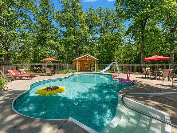 This Charming Brick & Limestone Ranch is nestled on 1.5 BEAUTIFULLY MANICURED ACRES. The PRIVATE BACKYARD is surrounded by arborvitaes and features lush flower gardens and a cozy firepit, ideal for gatherings or quiet relaxation. A STUNNING IN-GROUND POOL surrounded by an EXPANSIVE PATIO and a darling pool house creates your own PRIVATE OASIS!! Upon arrival, you'll be drawn to the lighted, stamped concrete walkway and WELCOMING COVERED FRONT PORCH. Inside, the unique LIMESTONE FLOORED ENTRY flows toward pristine HARDWOOD FLOORING, and a show-stopping DOUBLE SIDED STONE FIREPLACE, adding warmth and charm to the formal living room, dining room, and peaceful den. The kitchen is dressed in beautiful GRANITE COUNTERS and offers a coffee bar and an abundance of storage, providing access to the 4-SEASONS ROOM, where you'll enjoy year-round sunshine and quiet scenic views of the BACKYARD SANCTUARY. It's the perfect gathering space, featuring a wet bar, mini fridge, kegerator, and ample space for guests! The over-sized PRIMARY BEDROOM features a large private sitting area, spacious closet and huge private en suite with a sunken marble tub. Two other generously sized bedrooms, both with large closets are located near a full bath. The IMPRESSIVE OFFICE with oversized windows and vaulted ceiling is the a perfect blend of sophistication and warmth! Also on the main level you'll find a convenient half bath for guests, large laundry room, and a convenient "DROP ZONE" that offers outside access, and provides ample storage for coats, shoes, and everyday essentials. The FINISHED BASEMENT boasts a Rec Room with WOOD-BURNING FIREPLACE, Game Area, Wet Bar, 3/4 Bath and a Sauna! This BEAUTIFULLY MAINTAINED HOME is located just South of the Crown Point Square, and only minutes from award winning schools, an abundance of shopping and dining, plus top medical facilities. It offers the perfect blend of comfort and convenience. Don't miss your chance!! This truly is a hidden gem!!