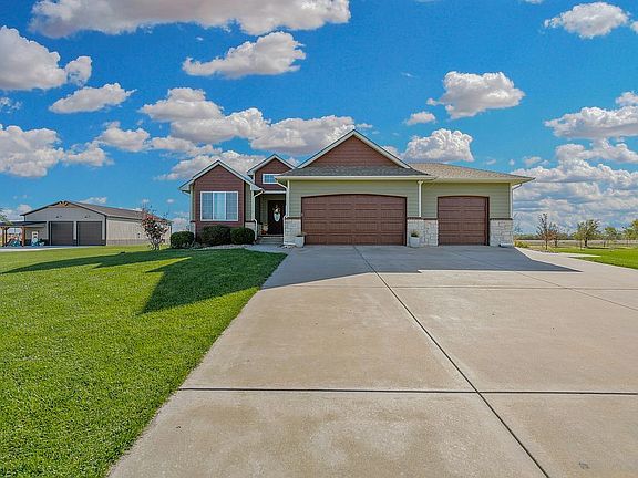 Discover this stunning custom-built home in Redmond Estates, Southwest Wichita, set on 1.29 acres. Offering both privacy and convenient access to city amenities, the open main floor is filled with natural light and includes 2 bedrooms, 2 bathrooms, a spacious 3-car garage, and an expansive walk-in butler’s pantry. Downstairs, you'll find a recreational room, a large bar area, 3 additional bedrooms, a bathroom, and a dedicated theater room. Unique custom features abound, including granite countertops, Geothermal HVAC, a 14'x24' shop with overhead door, pre-wired security system, surround sound, hot tub, and more. Enjoy relaxing evenings with breathtaking sunsets!