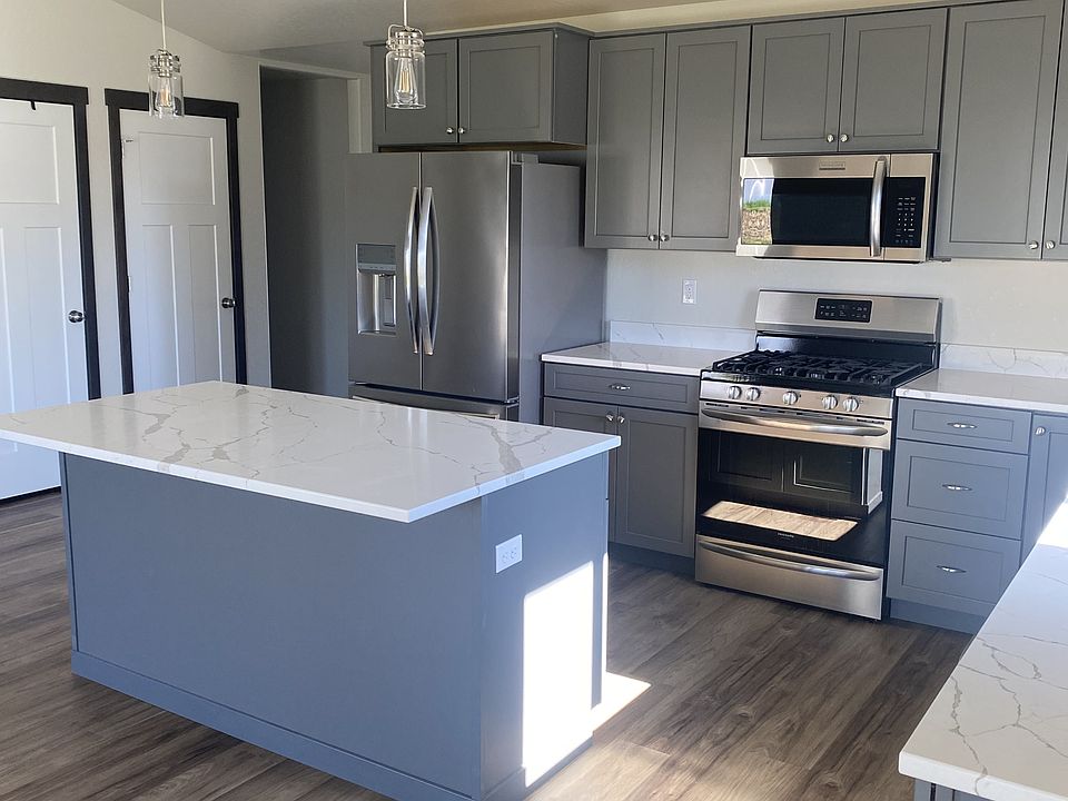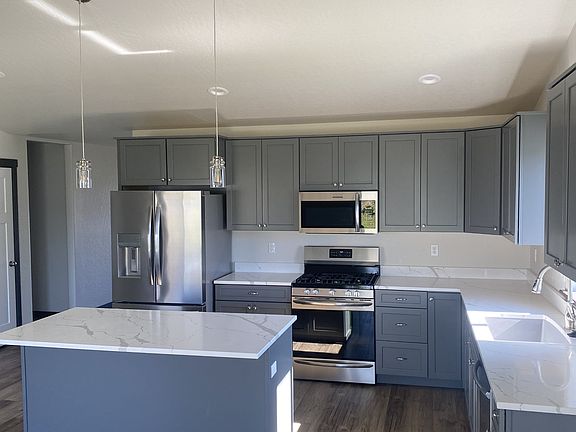 Step into this beautifully designed, nearly new one-story home offering 1,677 square feet of fresh, functional living. Nestled on a sunny corner lot with a fully fenced yard, this home is perfect for enjoying warm days and backyard gatherings. At the heart of the home is a beautiful new kitchen featuring vaulted ceilings, sleek quartz countertops, and a large entertaining island-ideal for casual breakfasts, evening cocktails, or hosting friends and family. The open-concept layout flows seamlessly into the dining and living areas, creating a warm and welcoming space.