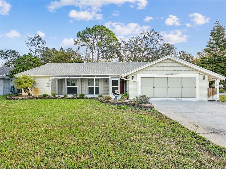 Welcome to 12614 Stone House Loop, a single-family home nestled in the desirable Beacon Woods community. This residence offers one of the largest 2 bedrooms, 2 bathrooms floor plans in the neighborhood. The living and dining room combination is perfect for entertaining, while a separate family room offers additional space for relaxation. The enclosed lanai extends the living area, allowing for enjoyment of the Florida weather year-round. The home's interior features a split bedroom floor plan, providing a primary bedroom with en-suite. Situated on a generous fenced in corner lot that offers ample outdoor space to enjoy. Other added features of this home include the 2024 AC, 2023 Roof replacement, hurricane shutters, private well for irrigation, and added AC split to make working in your garage workshop a breeze. The Beacon Woods community has many amenities such as a clubhouse, heated swimming pool, fitness center, sauna, tennis courts, and basketball courts.