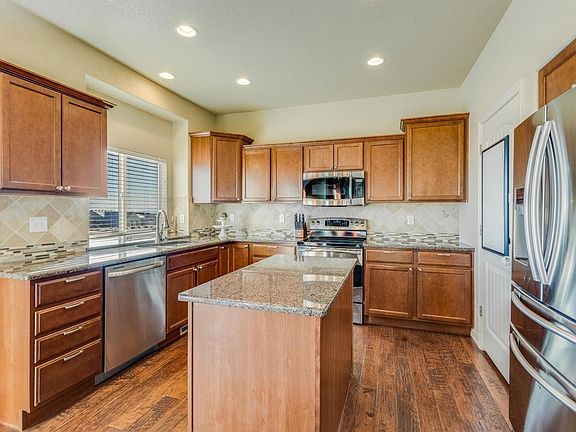 The main level offers a large living room/dining room & family room, with lovely honed engineered hardwood flooring. The lovely kitchen has room for multiple helpers. You will love the stainless steel appliances, granite countertops, planning desk and a custom tile backsplash. Abundant countertops, island and cabinetry, and large pantry provide an efficient working triangle with plenty of elbow room. The kitchen window over the sink looks out onto the back yard with a large stamped concrete patio, perfect for Summer evenings. No neighbors directly behind also gives a feeling of space. Oversized windows on the main level flood the space with natural light.