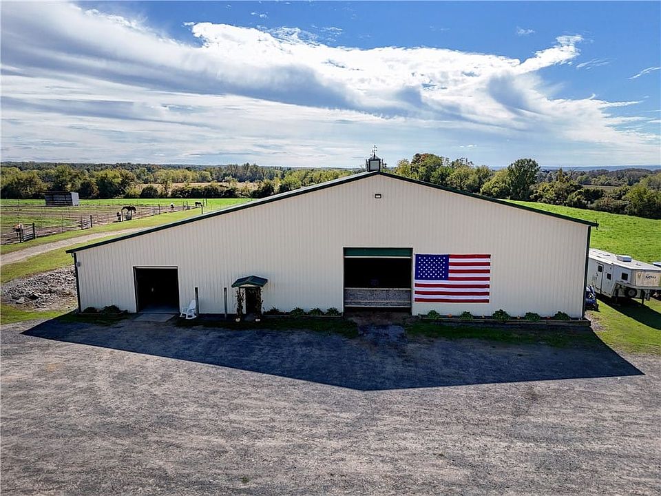 Built in 2009. 13.25 acres. Income producing facility currently at 88% capacity with awaiting list. 144x 114 indoor arena with 8 base consisting of sandy loam footing. Outdoorarena 90x180, also 60-foot round arena for lunging both consisting of 8 base of sandyloam footing. 12 indoor stalls: 12' by 10' tongue and groove, polyurethane, matted stallswith automatic thermostatically controlled in-stall waterers. 14 outdoor paddocks 40 ftby 150 ft with access to 220-amp electrical outlets. An indoor overhead arena wateringsystem on a timer for dust control. Indoor Wash Bay with Hot and cold-water spigots. 10ft by 12 ft Heated 6 ft by 12 ft Bathroom with utility sink and HOT/Cold water.Overhead storage space. Tack room with 18 saddle holds with overhead storage 8x12.Heated judging booth, with timer in loft above arena. PA system. Hay loft above stallarea accommodates 800 bales 8ft by 104 ft. 4 wireless Nest Bluetooth Cameras onpremises. 2 of 10 ft by 20 ft Runs. In Sheds that can accommodate 4 horses outside, 2horses in each. Energy efficient LED and skylights both overhead and side wallsprovide natural lighting for the HORSE-RIDING ARENA and HORSE STALLS. Septicsystem with 1,000-gallon tank back corner of arena. Property is equipped with generatorhook up, (generator not included). Public water, 200-amp service. All stalls are 12x10and have slide-out walls that can be easily converted to foaling stalls, so they become12x20. 5 Roll up overhead doors with remote control. (2 are14 foot, 2 are 10 feet, 1 is 7foot). Wi-Fi is free NYSIS. Laser locator for barrels. Open free span 15,000 SF arena.Arena is 18 feet to rafters with ample room for Equestrian hunter/Jumpers, Dressage,western pleasure or barrel racing/Gymkhana. Also, Tractor trailer accessible. OutsideDusk to Dawn lighting. Horseshoe gravel driveway with ample trailer and vehicleparking. Access to local trail system from barn. Feed/storage shed 8 ft by 12 ft. 9.25acres consist of tillable timothy and alfalfa mix. Roof on barn was refurbished in 2024.Timer with digital display output. Note: the House and Horse Barn each haveattached leach fields for septic system. 2025-09-24