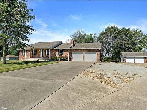 Just west of Nevada, Missouri in the sought-after Drywood Crest addition, this all-brick home on 3.3 acres offers a rare blend of space, function, and comfort in the Nevada R-5 School District. Inside, you'll find 4 bedrooms—including a non-conforming bedroom in the finished basement—and 3.5 bathrooms thoughtfully arranged across a spacious, well-designed layout. The main level features a cozy living room with a brick fireplace and insert, an oak kitchen with tile backsplash, and a dining area that opens to the large back deck—ideal for everyday living or weekend entertaining. Warm, wood-look flooring runs through the main living spaces, creating a welcoming, cohesive feel.
