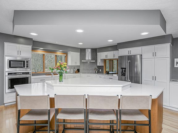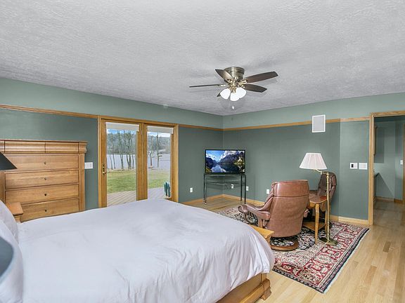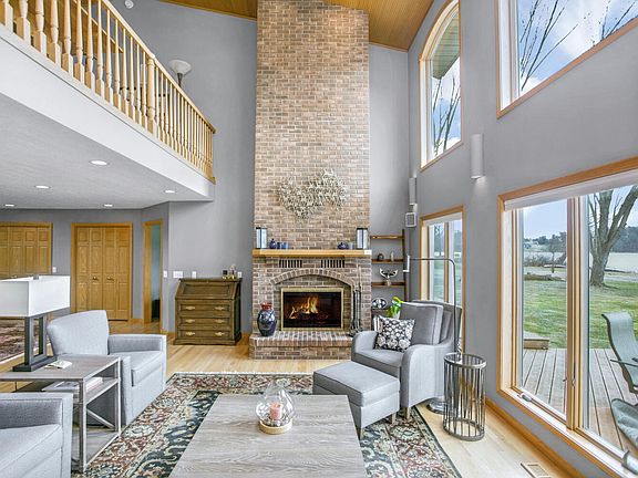 This four-bedroom, four-bath, 3,916-square-foot one-owner home stands on a 3.1-acre lot with 714 feet of Pleasant Lake waterfront with a floating dock and lift a tranquil, parklike wooded setting with plenty of privacy and nature views. Inside, the main level has a living area with oak floors, large windows, a brick woodburning fireplace, and access to a large elevated deck; an updated kitchen with an island with bar seating, a wet bar with refrigerator, deck access, and a passthrough to a carpeted TV room with a bay window; a primary bedroom with a sitting area open to a den/office with built-in bookshelves; a primary bath with a garden tub, standup shower, and dual vanities; two more baths; another bedroom; and a laundry. Upstairs are a large landing with lake views, two bedrooms, and a bath. The property includes an oversized attached two-car garage, a heated 24- by 32-foot pole barn, separate geothermal heating systems for upstairs and downstairs, and an underground sprinkler.