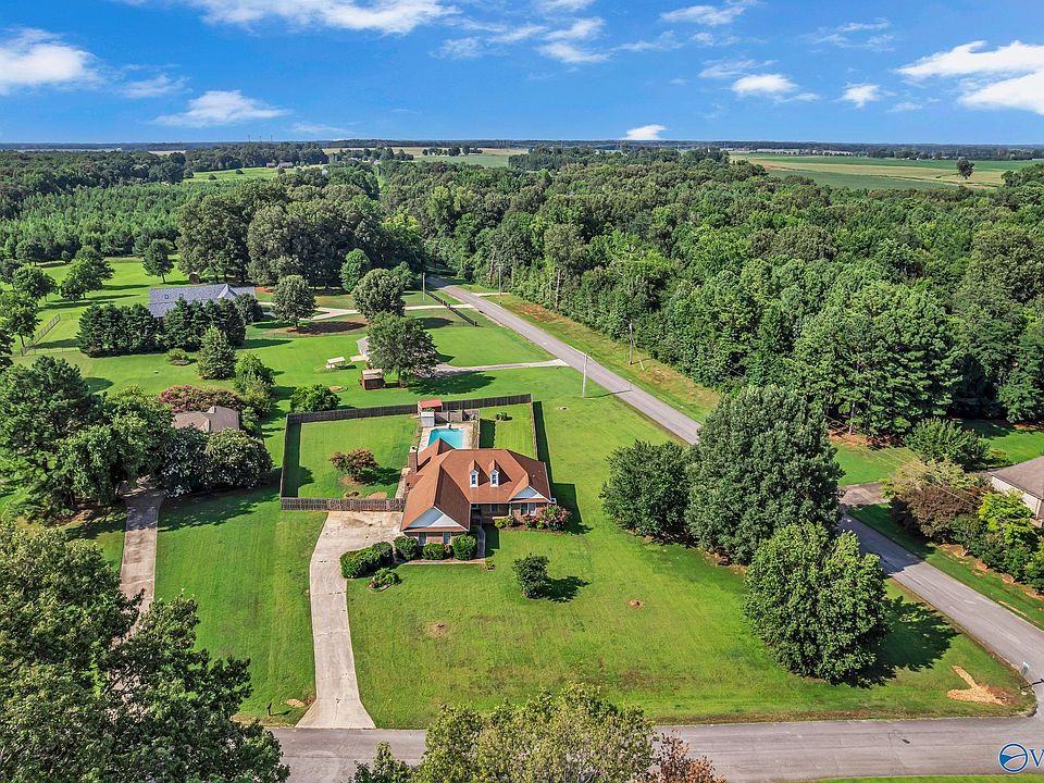 Full brick ranch on a huge corner lot over 1 acre with stunning Wheeler Lake views and deeded access to a neighborhood concrete boat ramp. Enjoy the in-ground pool, new privacy fence (2022), 10x12 utility shed, 2 1/2 car side entry garage, and pool pump (2023). Inside features fresh paint, updated LVP flooring, open concept living with vaulted ceilings and a fireplace. The master suite offers trey ceilings, double vanities, walk-in closet, tub, and separate shower. Includes whole house surge protector, generator hook-up, fiberglass storm shelter, and a 4" well for the irrigation system. HVAC 2020. A rare find with space, updates, and lake access! No HOA