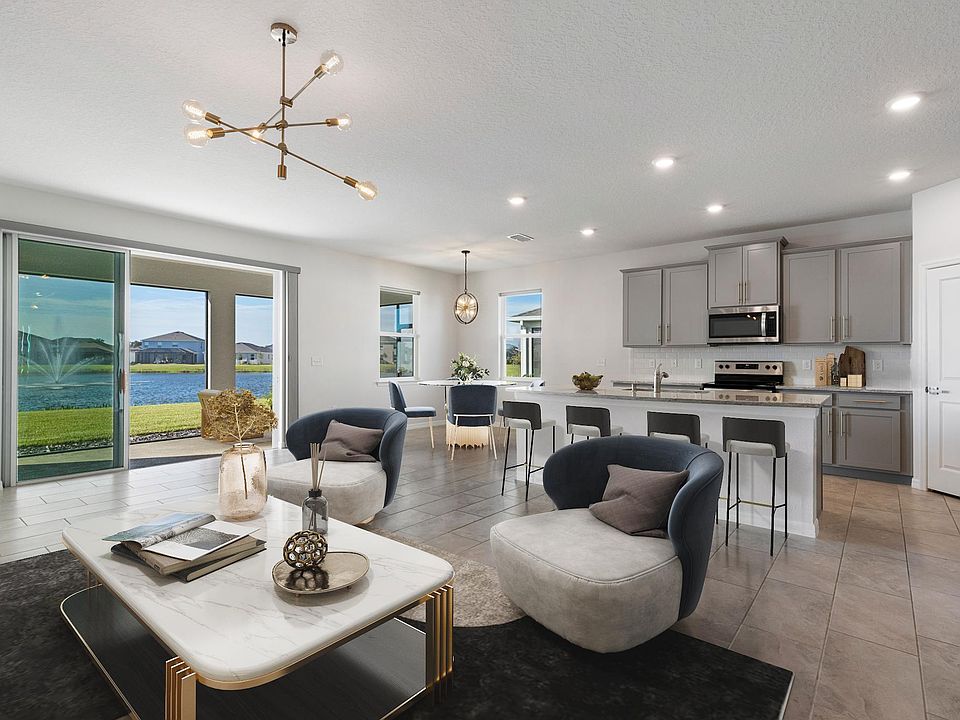 Inside, this spacious one-story 4 bedroom, 3 bath home features a beautiful open floor plan, a large kitchen with granite counters and walk-in pantry, and expansive living and dining areas perfect for modern living. Sliding doors open to a covered lanai with peaceful lake views and spectacular sunset skies each evening.