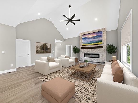 Step into a stunning open floor plan with soaring ceilings and a spacious great room highlighted by a floor-to-ceiling stone fireplace, creating the perfect gathering space for family and friends. The gourmet kitchen is a showstopper, boasting custom tile work, quartz countertops and backsplash, modern fixtures, and an ideal layout for both everyday living and entertaining.