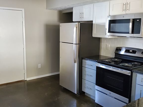 - Exterior features: Bulk pickup, Flooring: Concrete, Heating: Electric, Lawn, On-Site Management, One Year Lease, Online Maintenance Portal, Online Rent Payment, Townhomes have assigned carport space; shared with neighboring unit. Additional parking throughout complex for tenants, View Type: Wooded