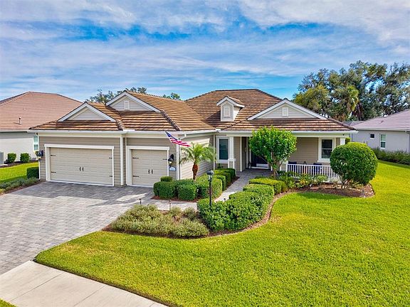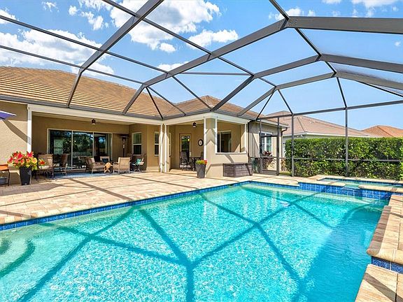 Welcome to Grand Palm, a premier resort-style, natural gas community just minutes from Historic Downtown Venice, Gulf beaches, Wellen Park, and I-75. This original-owner home sits on an oversized, private lot and is not in a flood zone. One of Neal Communities’ most desired floor plans, the Sanibel, offers just over 2,500 interior square feet and 3,883 total square feet under roof, featuring three bedrooms, three full bathrooms, and a club room or den with an open and functional design. Curb appeal stands out with beautiful landscaping, a paver driveway and walkway, a covered front porch sitting area, a tile roof, and perfectly manicured grounds. Inside, the gourmet kitchen showcases quartz countertops, a tile backsplash, 42-inch shaker cabinets, soft-close drawers, pull-out shelving, a natural gas range with stainless vent hood, convection oven, motion-activated faucet, stainless steel appliances, and a walk-in pantry with custom shelving. The spacious primary suite features two large walk-in closets, dual vanities, a soaking tub, a walk-in shower, and elegant finishes. Custom closets are found throughout the home, including the pantry, providing exceptional organization and storage. Step outside to your private outdoor retreat featuring a fully screened lanai built in 2020 with a custom WaterScapes pool and spa, both gas heated and surrounded by pavers, overlooking a peaceful preserve and pond with mature landscaping that provides complete privacy. The lanai is also plumbed for an outdoor kitchen, perfect for entertaining or relaxing with your morning coffee. Additional highlights include plantation shutters, custom window treatments, roller and accordion blinds, ceramic tile flooring, engineered hardwood in the den, overhead storage in the three-car garage, new hurricane-impact windows, power Kevlar storm screens on the lanai, and a whole-house natural gas generator. This home has been impeccably maintained and is move-in ready, offering the perfect blend of luxury, comfort, and peace of mind. Residents enjoy a vibrant, amenity-rich community with a fitness center, dog park, splash pad, tennis, pickleball, bocce, volleyball, kayaking, fishing, and miles of walking and biking trails. The on-site activities director plans regular events including live music, food trucks, trivia nights, and movie nights, creating a true sense of connection and fun.